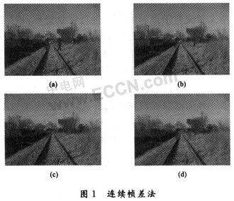 綜合考慮以上四種背景提取方法,本文采用結(jié)合多幀圖像平均法和連續(xù)幀差法這兩種方法來(lái)進(jìn)行視頻序列背景的提取?紤]到運(yùn)動(dòng)目標(biāo)的多樣性,有目標(biāo)經(jīng)過視場(chǎng)而引起的變化長(zhǎng)時(shí)間內(nèi)可忽略不計(jì)。多幀圖像平均法時(shí)將運(yùn)動(dòng)目標(biāo)看作為噪聲,用累加平均的方法消除噪聲,利用目標(biāo)運(yùn)行一段時(shí)間的序列圖像進(jìn)行平均而得到視場(chǎng)背景圖像。連續(xù)幀差算法是通過當(dāng)前幀的圖像與前一幀圖像的差值找到運(yùn)動(dòng)區(qū)域,對(duì)運(yùn)動(dòng)區(qū)域的背景保持不變,而非運(yùn)動(dòng)區(qū)域的背景則用當(dāng)前幀進(jìn)行更新,經(jīng)過一段時(shí)間的迭代便可提取出背景。兩種方法的結(jié)合可以很好地彌補(bǔ)各自的缺點(diǎn),能夠適應(yīng)鐵路沿線周邊環(huán)境的要求,對(duì)存在運(yùn)動(dòng)目標(biāo)的背景能夠提取出質(zhì)量較高的背景圖像。具體過程如下:
