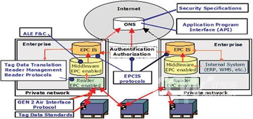 EPCglobal提出了Auto-ID系統(tǒng)的五大技術(shù)組成,分別是EPC(電子產(chǎn)品碼)標(biāo)簽、RFID標(biāo)簽閱讀器、ALE中間件實現(xiàn)信息的過濾和采集、EPCIS信息服務(wù)系統(tǒng),以及信息發(fā)現(xiàn)服務(wù)(包括ONS和PML)。由于從一開始就讓世界各大洲的從業(yè)人員充分參與,EPCGlobal標(biāo)準(zhǔn)(架構(gòu)圖如下)得到了較廣泛認(rèn)同,這里不再對其標(biāo)準(zhǔn)體系架構(gòu)贅述。