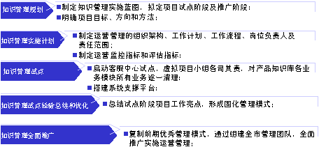 萬丈高樓平地起,本項目由客服中心總經(jīng)理牽頭,副總經(jīng)理和部門經(jīng)理組成領(lǐng)導(dǎo)小組,全面審視中心運營管理現(xiàn)狀,探索“SECI知識循環(huán)管理”理論與實際工作結(jié)合點,針對客服中心滿意度提升的三大主要癥結(jié)勾勒出知識管理實施藍(lán)圖,試點階段和推廣階段,總體目標(biāo)和階段性目標(biāo),監(jiān)控手段和評估指標(biāo)等。