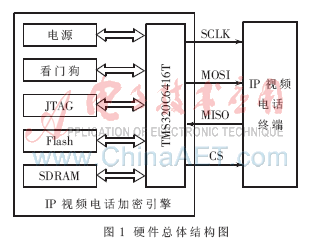 加密引擎以TMS320C6416T為核心,包括SDRAM、Flash、電源、JTAG接口、看門(mén)狗等。加密引擎和IP視頻電話(huà)終端通過(guò)SPI總線(xiàn)通信,硬件總體結(jié)構(gòu)如圖1所示。