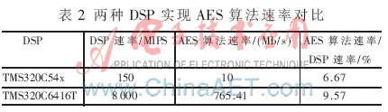 參考文獻(xiàn)[5]在TMS320C54x DSP上實(shí)現(xiàn)了AES算法,表2給出兩種實(shí)現(xiàn)方式的對(duì)比。