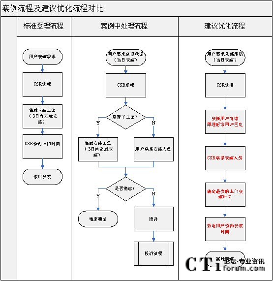 通過對比,很明顯后者減少了流程中的關(guān)鍵角色,提高了流程的執(zhí)行效率。CSR直接為用戶提供了“一站式服務(wù)”,用戶只需要通過一個電話便能解決問題,而至于CSR與安裝人員的工作協(xié)調(diào),完全不需要用戶去介入。
