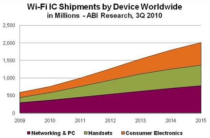 Wi-Fi技術(shù)現(xiàn)已被用于幾乎所有筆記本和上網(wǎng)本、智能電話和游戲設(shè)備。電話、音頻播放器、打印機(jī)、機(jī)頂盒以及其他消費(fèi)類電子設(shè)備對Wi-Fi技術(shù)的采用率也在不斷增加,來自Wi-Fi聯(lián)盟和多家調(diào)研機(jī)構(gòu)的數(shù)據(jù)印證了這種市場增長趨勢。2009年,僅在中國銷售的具備Wi-Fi功能的筆記本電腦就達(dá)到800萬臺(tái),全球Wi-Fi設(shè)備認(rèn)證數(shù)量則增加了約50%,消費(fèi)類電子設(shè)備和電話數(shù)量增加了100%以上。截止到2010年7月,消費(fèi)類電子設(shè)施與電話類產(chǎn)品的認(rèn)證數(shù)量已經(jīng)超過了2009年全年數(shù)量,預(yù)計(jì)全年售出約8億臺(tái)Wi-Fi設(shè)備。