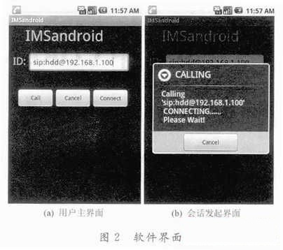 封裝后安裝到Android手機(jī)、MID或虛擬機(jī)中,并發(fā)起會(huì)話。與開(kāi)源SIP軟件Linphone通信的結(jié)果如圖2所示。