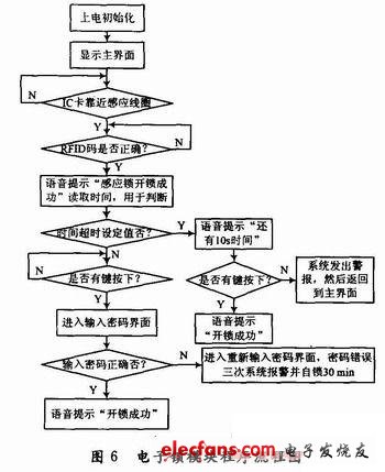 如圖2所示,電子鎖原始密碼和用戶設(shè)定密碼已存于外部存儲(chǔ)器E2PROM內(nèi),用戶要開門需先用電子感應(yīng)鑰匙開RFID碼感應(yīng)鎖,當(dāng)感應(yīng)鎖成功開鎖時(shí),系統(tǒng)將發(fā)出語音提示“感應(yīng)鎖開鎖成功”,然后輸入先前設(shè)定的密碼,密碼正確后,系統(tǒng)發(fā)出語音提示“開鎖成功”,否則提示“輸入密碼錯(cuò)誤”。輸入密碼三次以上錯(cuò)誤,系統(tǒng)將報(bào)警并自鎖30 min。整個(gè)開鎖時(shí)間不能超過30 s,否則系統(tǒng)發(fā)出警報(bào)聲,以防止盜賊在短時(shí)間內(nèi)利用萬能工具開鎖。系統(tǒng)待機(jī)時(shí)能在液晶上顯示時(shí)間、日期和星期等信息,實(shí)現(xiàn)友好的人機(jī)界面。