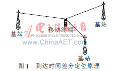 TDOA定位技術(shù)是根據(jù)不同基站接收到的同一移動(dòng)終端信號(hào)在傳輸路徑上的時(shí)延差異實(shí)現(xiàn)終端定位。當(dāng)移動(dòng)終端發(fā)出緊急呼叫時(shí),移動(dòng)網(wǎng)絡(luò)通過其附近的三個(gè)或更多個(gè)不同基站接收并測(cè)量出信號(hào)的到達(dá)時(shí)間,網(wǎng)絡(luò)計(jì)算出到達(dá)時(shí)間兩兩之間的差值,移動(dòng)終端必然位于這些時(shí)間差值所對(duì)應(yīng)的以兩兩基站為焦點(diǎn)的雙曲線上[2]。這樣,根據(jù)兩條雙曲線的交點(diǎn)就能夠確定手機(jī)的位置。所以只要附近三個(gè)基站接收到移動(dòng)終端發(fā)出的信號(hào)就可以達(dá)到定位目的。TDOA技術(shù)只需要移動(dòng)通信網(wǎng)絡(luò)參與網(wǎng)絡(luò)參數(shù)的測(cè)量,不需要對(duì)終端硬件上的改動(dòng)。因此實(shí)現(xiàn)TDOA定位只需要在移動(dòng)通信網(wǎng)中增加相應(yīng)功能模塊就可以了,并支持所有廠商生產(chǎn)的移動(dòng)終端。同時(shí)它具有定位精度高、響應(yīng)時(shí)間短、實(shí)現(xiàn)簡(jiǎn)單等優(yōu)點(diǎn)。