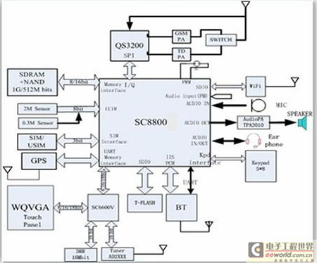 方案集成度高、設(shè)計(jì)簡潔:基于SC8800、QS3200和SC6600V的設(shè)計(jì)方案框圖如下圖,僅三顆主芯片就實(shí)現(xiàn)了TD-SCDMA多媒體功能手機(jī)電視方案,方案公司硬件設(shè)計(jì)方便。