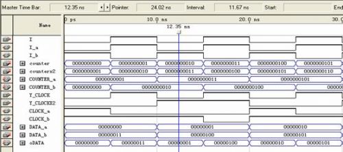 使用的信號(hào)包括:數(shù)據(jù)信號(hào)data_a,dat_b;讀寫有效信號(hào)wren_a,wren_b;地址信號(hào)address_a,address_b;時(shí)鐘信號(hào)clock_a,clock_b;輸出數(shù)據(jù)信號(hào)q_a,q_b?梢钥吹剿械男盘(hào)都是成對(duì)出現(xiàn)的,就是為了進(jìn)行乒乓方式的數(shù)據(jù)傳輸。分成了兩個(gè)RAM區(qū)域,A和B,相當(dāng)于前面講乒乓方式里的數(shù)據(jù)緩沖模塊1和2。兩個(gè)RAM塊是交替著讀寫(由I_a和I_b決定),輸出數(shù)據(jù)流也是由I決定。剛說(shuō)到寫時(shí)鐘是13.5M,讀時(shí)鐘是27M,所以clock_a和clock_b必須是讀寫時(shí)鐘切換著輸入,而且地址的計(jì)數(shù)也不一樣,寫周期時(shí)候地址增加的時(shí)鐘是13.5M,讀周期地址增加的時(shí)鐘是27M。所以每行的數(shù)據(jù)讀了兩遍,相當(dāng)于隔行變逐行。圖6在Qartus II下RAM的乒乓操作功能仿真圖: