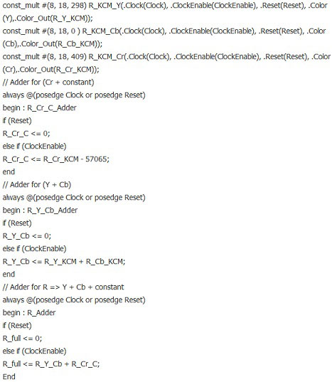 以R = (1/256) * ( 298*Y + 409*Cr - 57065 )為例,主要代碼如下: