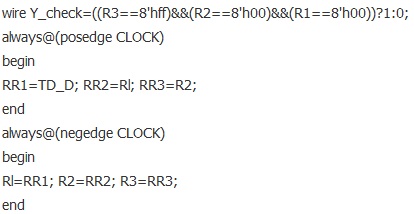 其中的wire變量Y_check就是當(dāng)檢測(cè)到FF,00,00的時(shí)候就為1的標(biāo)志。根據(jù)上文所述,區(qū)分SAV和EAV是根據(jù)XY來(lái)決定,區(qū)分奇偶場(chǎng)是根據(jù)XY來(lái)區(qū)分,所以只有隨后的信號(hào)是SAV的時(shí)候,信號(hào)分配電路才有效,所以需要描述一段邏輯來(lái)判斷,代碼如下: