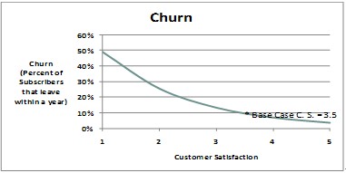 部署智能管道可以在網(wǎng)絡(luò)容量和業(yè)務(wù)保障方面產(chǎn)生積極影響。針對(duì)高端用戶提供免溢價(jià)的高價(jià)值服務(wù)/業(yè)務(wù),會(huì)提高高端用戶群體的滿意度。高端用戶是高額利潤的保障,是所有運(yùn)營商爭取的目標(biāo),而用戶滿意度是決定他們是否留在網(wǎng)絡(luò)的最重要因素。應(yīng)用智能管道后,預(yù)期年離網(wǎng)率將下降1%~2%。離網(wǎng)率的降低,將使用戶平均停留在本網(wǎng)絡(luò)的周期加長,從而增加收入并減少新用戶的獲取成本。這一部分的價(jià)值和意義,將大于資源合理分配和差異化業(yè)務(wù)的價(jià)值。下面的圖表顯示了離網(wǎng)率和用戶滿意度的關(guān)系。