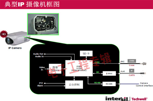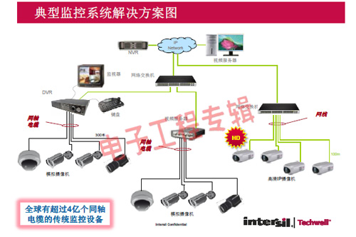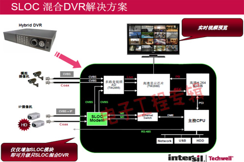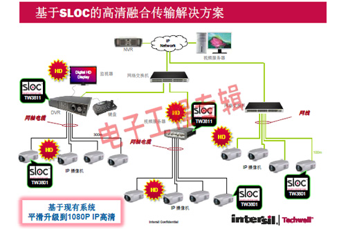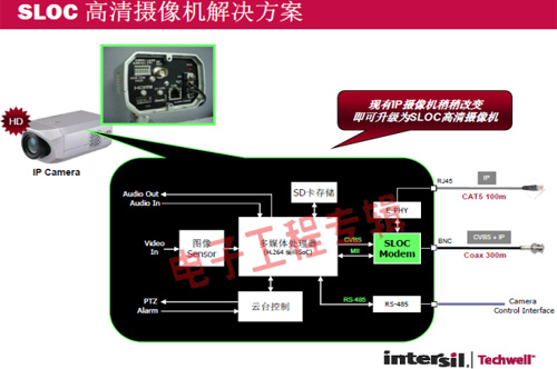 革命性的Intersil Techwell SLOCTM(Security Link over Coax)同軸電纜復(fù)合視頻傳輸解決方案是可通過一條同軸電纜同時(shí)傳輸模擬 CVBS 視頻和高清數(shù)字 IP 視頻信號(hào)的先進(jìn)調(diào)制解調(diào)器解決方案,其采用最新MODEM PHY技術(shù)的傳輸解決方案,可以基于同軸電纜同時(shí)傳輸高清IP碼流和標(biāo)清模擬實(shí)時(shí)視頻。