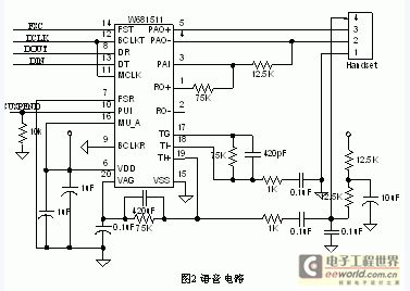 IP電話的原理圖如圖1所示。它由Tiger560B和W681511及其外圍設(shè)備和接口組成。主要電路有:語音電路、LCD顯示電路、鍵盤電路。