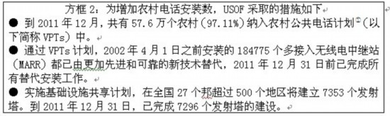 農(nóng)村電話安裝數(shù)從2007年3月的4710萬增加到2011年3月的2億8229萬,2011年12月達(dá)到3億1539萬。農(nóng)村電話數(shù)占全國電話總數(shù)的比例也從2007年的22.88%增加到2011年12月的34.04%。移動(dòng)電話數(shù)量對(duì)農(nóng)村電話總數(shù)的增加貢獻(xiàn)很大。移動(dòng)電話在農(nóng)村電話總數(shù)中的比重從2007年3月的73.33%提高到2011年3月的96.90%,到2011年12月達(dá)到97.53%。2011-2012年(到12月)期間,農(nóng)村電話數(shù)量的增長率為11.73%,而城市電話用戶增長率則為8.35%。個(gè)人用戶是農(nóng)村電話數(shù)增加的主要推動(dòng)力,個(gè)人用戶占農(nóng)村電話總數(shù)的比重從2007年的51.87%上升到2011年2月的86.78%。為了增加農(nóng)村電話安裝總數(shù),USOF采取了以下措施,請(qǐng)見方框2所示。