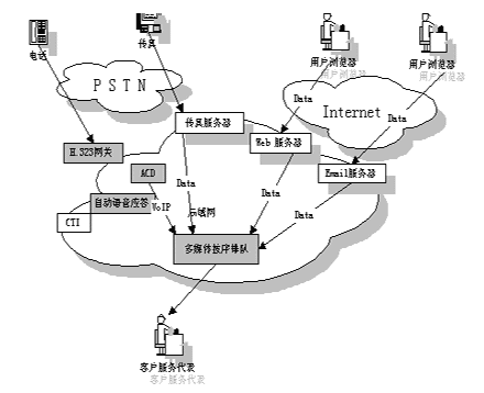 多媒體呼叫中心實(shí)際上是基于CTI 技術(shù)的傳統(tǒng)呼叫中心與 ICC 的相互結(jié)合。現(xiàn)在許多呼叫中心把各種媒體通信技術(shù)集成到了一起,允許座席員同時(shí)可以處理語音呼叫﹑Web請求﹑e-mail和傳真。其簡單示意圖如下: