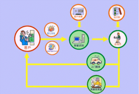 售后技術咨詢及報修:用戶購機之后,同樣可以通過電話或者網(wǎng)絡進入呼叫中心系統(tǒng),系統(tǒng)會通過用戶檔案庫得到用戶的詳細信息并為他尋找合適的咨詢員,咨詢員會依據(jù)共享的知識庫為用戶解決問題,如果用戶的機器需要上門服務。咨詢員會通過網(wǎng)絡查詢?nèi)珖⻊涨赖墓こ處熀蛡浼闆r,并安排工程師迅速上門為用戶服務。維修完成一天后,系統(tǒng)會自動產(chǎn)生電話呼出,由咨詢員直接詢問用戶對服務過程的滿意程度,以便改進我們的工作。
