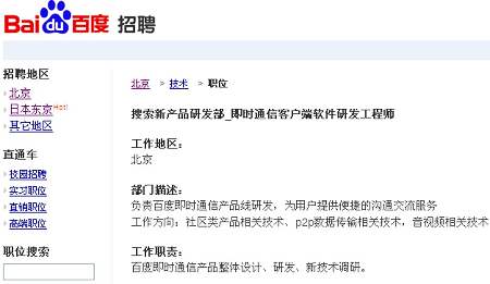 百度有意推IM產(chǎn)品的傳聞?dòng)蓙硪丫,不過該傳聞一直未得到官方證實(shí)。但在其官網(wǎng)最新公布的招聘頁面中,百度已向外界羅列出即時(shí)通信客戶端軟件研發(fā)工程師(搜索新產(chǎn)品研發(fā)部)、即時(shí)通信軟件產(chǎn)品經(jīng)理(客戶端軟件業(yè)務(wù)部)等職位,上述工作地點(diǎn)均在北京,可見百度的IM戰(zhàn)略布局已具雛形。