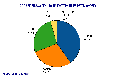 根據(jù)易觀國(guó)際(Analysys International)的研究顯示,2008年第3季度廠商的競(jìng)爭(zhēng)格局方面沒(méi)有顯著變化,中國(guó)IPTV市場(chǎng)主要廠商情況如下: