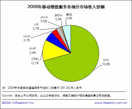 艾瑞研究發(fā)現(xiàn),2008年移動增值服務(wù)細分市場收入中SMS以70.8%的比例占據(jù)主導(dǎo)地位,但其他業(yè)務(wù)對SMS的分流和替代使其增長率有所下降;CRBT、WAP分別以12.1%和5.4%的比例位居第二、第三。