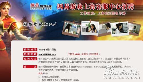 網(wǎng)易表示,招聘將從2009年4月21日起正式開始,將提供優(yōu)厚的待遇、完善的福利及勞動(dòng)保障。截至21日0時(shí),該頁(yè)面顯示網(wǎng)易已接收到6048份簡(jiǎn)歷。