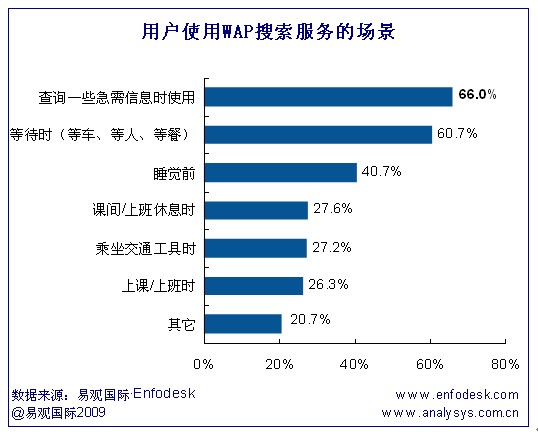 根據易觀Enfodesk《中國移動搜索市場用戶調研報告2009》研究發(fā)現(xiàn),用戶使用WAP搜索服務,一般情況是在查詢一些急需信息和等待時(等車、等人、等餐),這兩類情形的使用比例均在60%以上。值得注意的是,在睡覺前,用戶使用移動搜索服務的比例達40.7%。而在其他休閑時間,如課間/上班休息時、乘坐交通工具、上課/上班時也是用戶經常使用WAP搜索服務的場景。