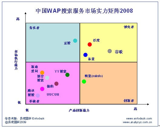 2008年WAP搜索市場中處于務(wù)實者象限的主要廠商是宜搜。2008年宜搜年收入占整個WAP搜索市場的36%。這主要歸因于宜搜在整個2008年在市場推廣和營銷方面投入了大量的人力以及資金投入。