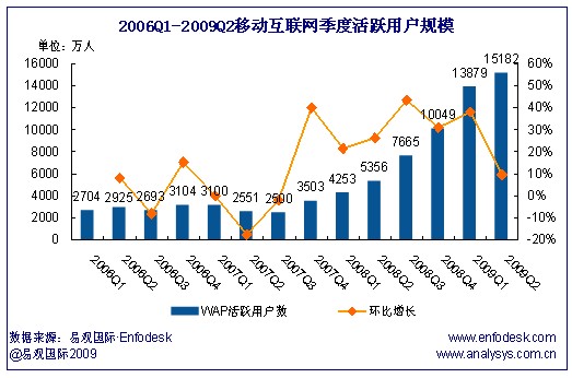 2009年第2季度中國移動互聯(lián)網(wǎng)活躍用戶規(guī)模達1.52億