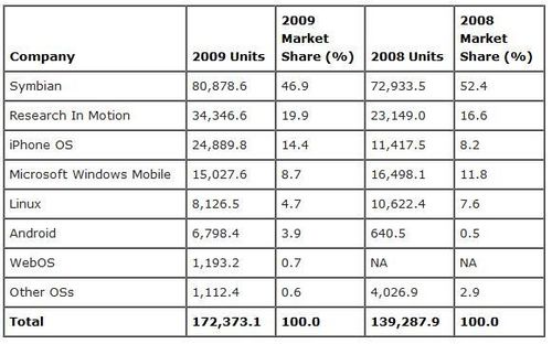 根據(jù)Gartner的數(shù)據(jù)顯示,去年共銷售出的智能手機(jī)達(dá)1.72億部,比前年上漲了24%,然而全世界手機(jī)的銷售總量卻并無(wú)起色(2008年為12.2億部,而2009年為12.1億部。在去年銷售的所有手機(jī)中,智能手機(jī)占14%,較2008(11%)年有所提升。iPhone盡管去年漲勢(shì)迅猛,只占去年各種手機(jī)銷售總量的2%。