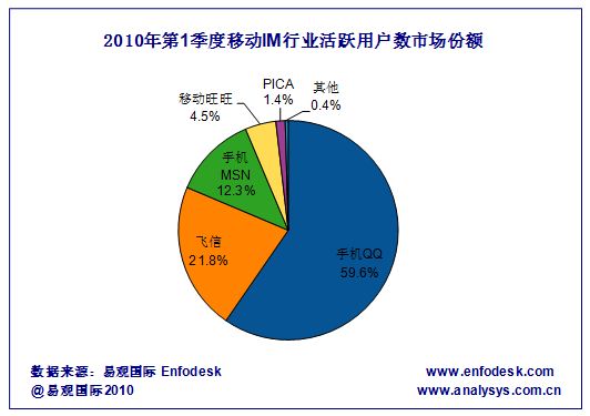 據(jù)易觀國際Enfodesk產(chǎn)業(yè)數(shù)據(jù)庫近期發(fā)布的《2010年第1季度中國市場(chǎng)移動(dòng)IM數(shù)據(jù)監(jiān)測(cè)報(bào)告》研究顯示:2010年第1季度中國市場(chǎng)移動(dòng)IM活躍用戶數(shù)環(huán)比增長超過18%,總數(shù)突破1.6億,累計(jì)賬戶數(shù)環(huán)比增長10.97%,總數(shù)超過3.8億,相比09年第4季度依然取得了較快的增長。但是基于整體市場(chǎng)來看,移動(dòng)IM活躍用戶數(shù)市場(chǎng)格局并沒有發(fā)生太大變化,手機(jī)QQ仍然以59.6%的市占率名列市場(chǎng)第一,飛信、手機(jī)MSN位列二三名,具體市場(chǎng)占比及排名如下圖所示: