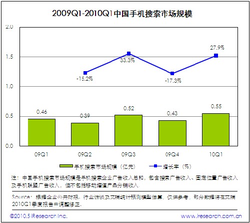 2010Q1中國(guó)手機(jī)搜索市場(chǎng)規(guī)模為5500萬,環(huán)比增長(zhǎng)27.9%,手機(jī)搜索請(qǐng)求量和PV的大幅增長(zhǎng)帶動(dòng)廣告收入增加。自2009年下半年以來,受手機(jī)上網(wǎng)用戶規(guī)模迅速發(fā)展以及用戶活躍度和黏性顯著增加的影響,手機(jī)搜索市場(chǎng)進(jìn)入快速發(fā)展階段。與此同時(shí),手機(jī)搜索企業(yè)紛紛加大市場(chǎng)投入力度,建立與電信運(yùn)營(yíng)商和手機(jī)終端廠商的深度合作關(guān)系是業(yè)務(wù)拓展的重點(diǎn)方向。此外,網(wǎng)頁(yè)產(chǎn)品和客戶端軟件深度整合也是手機(jī)搜索企業(yè)布局移動(dòng)互聯(lián)網(wǎng)市場(chǎng)的最佳實(shí)踐。受谷歌事件影響,艾瑞預(yù)計(jì)2010Q2手機(jī)搜索市場(chǎng)集中度將進(jìn)一步提高。