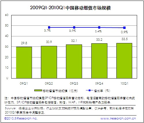 電信運(yùn)營(yíng)商計(jì)費(fèi)政策重大調(diào)整對(duì)整個(gè)移動(dòng)增值市場(chǎng)產(chǎn)生巨大影響力,2010Q1移動(dòng)增值市場(chǎng)規(guī)模為33.5億,與09Q1基本持平。電信運(yùn)營(yíng)商實(shí)施計(jì)費(fèi)通道的強(qiáng)力治理措施,對(duì)產(chǎn)品線以WAP計(jì)費(fèi)為主的企業(yè)造成嚴(yán)重生存壓力,與此同時(shí)采用短信計(jì)費(fèi)的移動(dòng)增值產(chǎn)品營(yíng)銷也受到不同程度影響。實(shí)現(xiàn)由單一移動(dòng)增值業(yè)務(wù)向移動(dòng)互聯(lián)網(wǎng)服務(wù)進(jìn)行戰(zhàn)略轉(zhuǎn)型,是SP企業(yè)戰(zhàn)略發(fā)展的實(shí)踐路徑。艾瑞認(rèn)為電信運(yùn)營(yíng)商實(shí)施全新的合作伙伴計(jì)費(fèi)政策,將重新構(gòu)建移動(dòng)增值市場(chǎng)秩序。