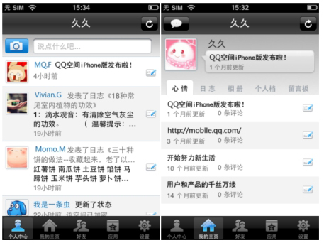 QQ空間foriPhone的外觀界面完全繼承了iPhone上應(yīng)用軟件的清新簡(jiǎn)潔風(fēng)格,軟件主界面包括個(gè)人中心、我的主頁(yè)、好友、應(yīng)用、設(shè)置五大功能。點(diǎn)擊個(gè)人中心可以看到自己的狀態(tài)、簽名以及好友的最新動(dòng)態(tài)。并且可以直接使用置頂?shù)呐恼真I拍照,即時(shí)拍照上傳至空間,使用置頂?shù)男那檩斎肟蛴涗涀约旱男那椤?br />
