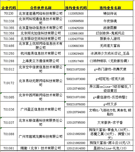 依據(jù)省移動公司上報調(diào)查發(fā)現(xiàn),下列合作伙伴存在違約行為,依據(jù)《中國移動游戲業(yè)務合作伙伴信用積分管理辦法V2.0》,處理如下: