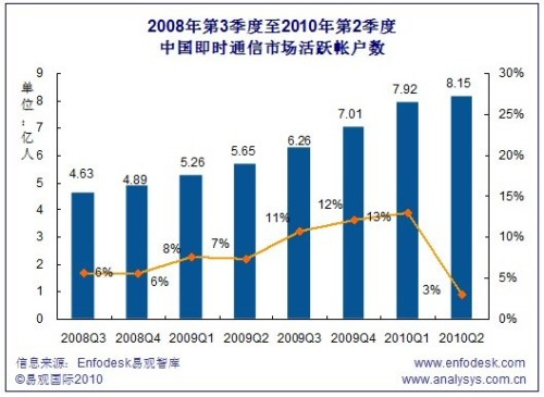 2010Q2中國即時通信市場活躍帳戶數超過8億