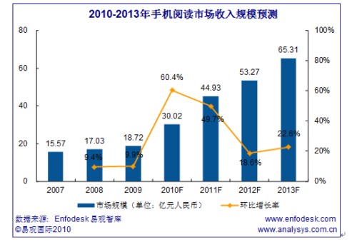 易觀國際(Analysys International)分析預(yù)計(jì)2010年手機(jī)閱讀市場規(guī)模將突破30億元。