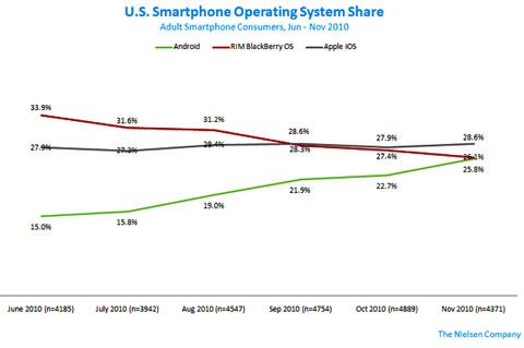 北京時(shí)間1月4日早間消息,市場(chǎng)研究公司尼爾森周一發(fā)布的報(bào)告顯示,在美國(guó)智能手機(jī)市場(chǎng),蘋(píng)果的iOS的份額仍然排名首位,市場(chǎng)占有率為28.6%。