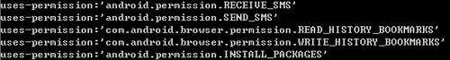圖:增加的權(quán)限部分:加了收取和發(fā)送短信以及讀取和寫入書簽的權(quán)限