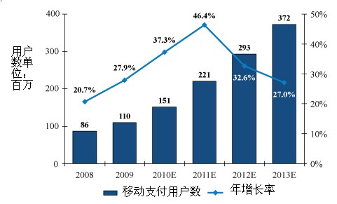 基于“中國計(jì)算機(jī)世界”的研究預(yù)測,中國移動支付用戶在2009年底達(dá)到1.1億,預(yù)計(jì)將在2013年超過3倍。由于需求大幅提高,電信運(yùn)營商會繼續(xù)在每個(gè)省推出移動支付解決方案網(wǎng)絡(luò)。反過來,也會刺激第三方平臺和供應(yīng)商的發(fā)展。