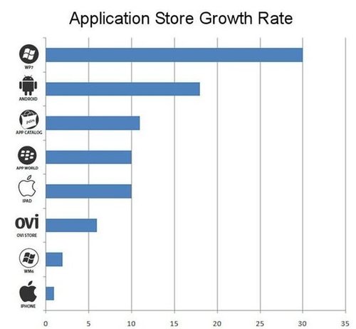 專注于App Store發(fā)展得研究者Distimo昨天公布了一份有關(guān)手機(jī)應(yīng)用程序商店的市場報(bào)告,報(bào)告顯示W(wǎng)indows Phone 7的增長速度高達(dá)30%。