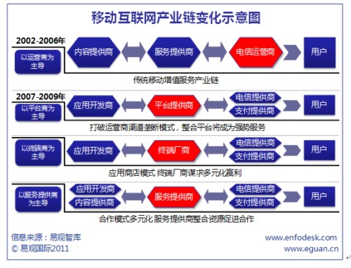 易觀國際(Analysys International)研究認為移動互聯(lián)網(wǎng)新的產(chǎn)業(yè)鏈正在醞釀,不同產(chǎn)業(yè)鏈環(huán)境正在爭奪產(chǎn)業(yè)鏈主導權(quán),具體如下: