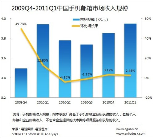 2011年Q1中國(guó)手機(jī)郵箱市場(chǎng)收入規(guī)模達(dá)3.95億元