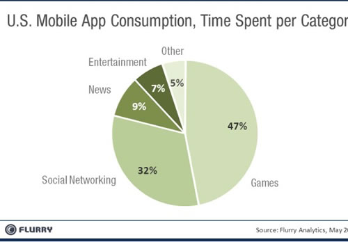 Flurry研究了不同應(yīng)用類別占用時(shí)間。通過對(duì)2011年5月份超過8.5萬個(gè)應(yīng)用數(shù)據(jù)的抓取,得到如圖數(shù)據(jù):