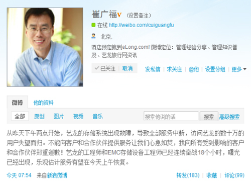 今日上午7:54,崔廣福通過微博對外證實,藝龍網(wǎng)站的無法訪問,是由于存儲系統(tǒng)出現(xiàn)故障,導(dǎo)致全部服務(wù)中斷,因此讓訪問藝龍的數(shù)十萬用戶失望而歸。