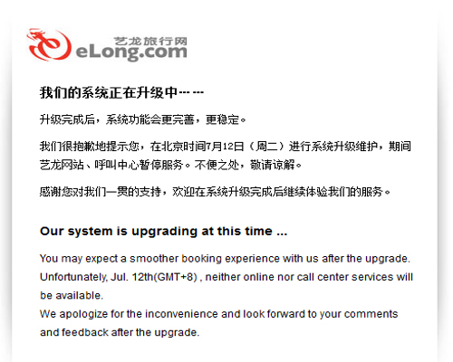 截至發(fā)稿時,藝龍服務(wù)依然沒有恢復(fù)。其主頁依然顯示“我們的系統(tǒng)正在升級中……”