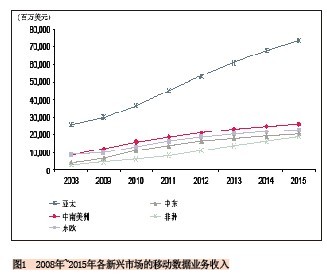 就絕對值來看亞太地區(qū)的新興市場將占主導地位,該地區(qū)的移動數(shù)據(jù)業(yè)務(wù)收入將從2010年的368億美元增長到2015年的734億美元,增長率幾乎為100%。給出這么高的預測值不足為奇,因為該市場上有中國、印度、印尼“三大巨頭”,這三個國家對該區(qū)域數(shù)據(jù)業(yè)務(wù)收入的貢獻將達到81%。