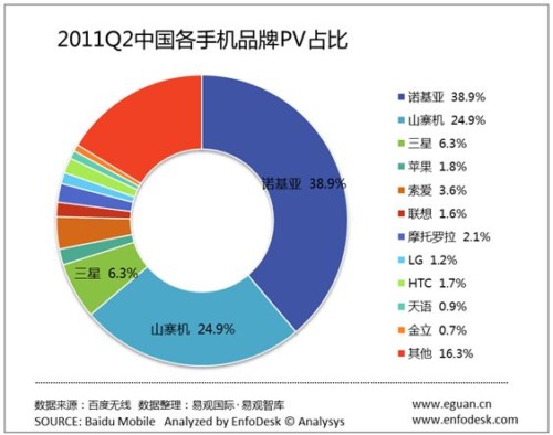 2、諾基亞智能手機受Android系對手沖擊,份額下滑。2011年第二季度諾基亞手機PV份額占到39%,相比上季度的40.4%,環(huán)比下降3%。其原因主要是受到來自安卓系統(tǒng)智能手機品牌與山寨機雙向的擠壓。最主要的還是安卓系統(tǒng)這一開放系統(tǒng)聚集了大量的智能手機品牌,從而適用于安卓系統(tǒng)的應(yīng)用迅速擴大規(guī)模,占領(lǐng)智能手機市場較大份額。