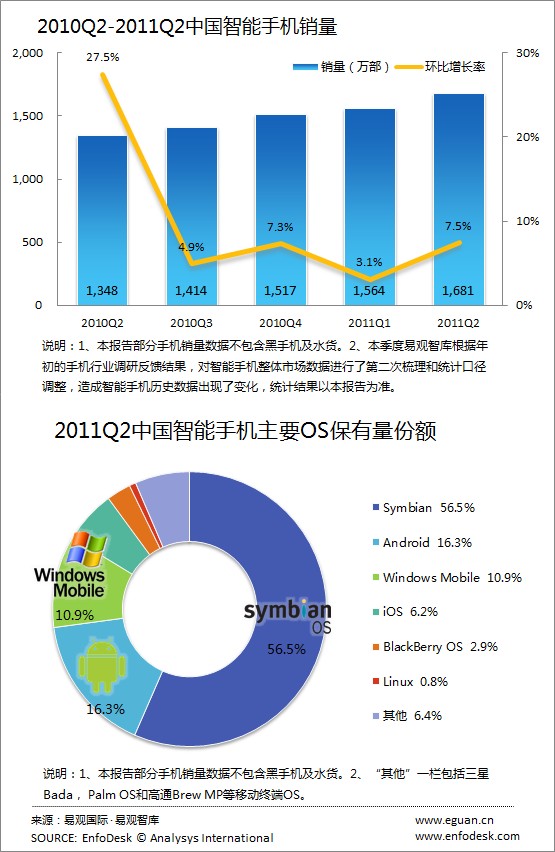 CTI論壇(ctiforum)4月29日消息(記者 潘婷婷):根據(jù)易觀智庫(kù)EnfoDesk近期發(fā)布數(shù)據(jù)顯示,中國(guó)智能手機(jī)市場(chǎng)2011年第2季度國(guó)內(nèi)銷售總量達(dá)1681萬部(不計(jì)黑手機(jī)和水貨手機(jī)),環(huán)比增長(zhǎng)7.5%。