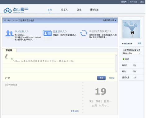 點(diǎn)心盒同步的另一特色功能就是云端收發(fā)短信和查看通話(huà)記錄。由于點(diǎn)心盒同步開(kāi)啟自動(dòng)同步之后是即時(shí)同步的,即使忘記帶手機(jī)也沒(méi)有關(guān)系,可以通過(guò)登陸點(diǎn)心盒網(wǎng)站來(lái)查看短信和通話(huà)記錄,這樣就可以看到?jīng)]帶手機(jī)期間誰(shuí)聯(lián)系過(guò)自己,可通過(guò)云端進(jìn)行短信收發(fā),而且可利用云端來(lái)快速大量發(fā)送短信。用戶(hù)只需一臺(tái)可以上網(wǎng)的電腦或Pad,登錄點(diǎn)心盒,就可以隨時(shí)隨地打開(kāi)網(wǎng)頁(yè)瀏覽手機(jī)里的資料。