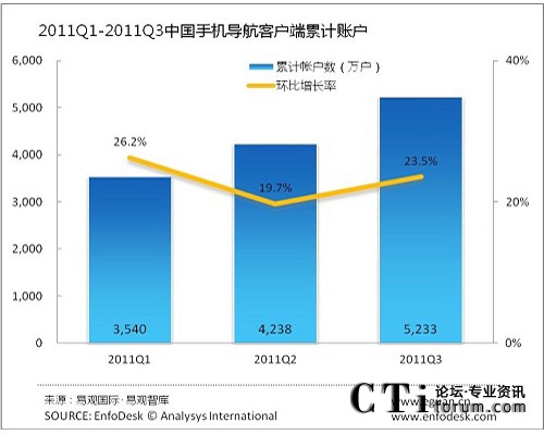 2011年3季度中國手機導(dǎo)航客戶端帳戶達(dá)5233萬