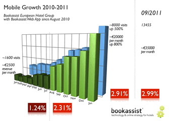 圖表1顯示了一座歐洲小城的一家城市酒店集團(tuán)自2010年以來的移動(dòng)業(yè)務(wù)發(fā)展趨勢(shì)。這家酒店集團(tuán)到2010年底才推出移動(dòng)優(yōu)化的網(wǎng)站,但從2010年8月份起采用了我們的移動(dòng)解決方案。